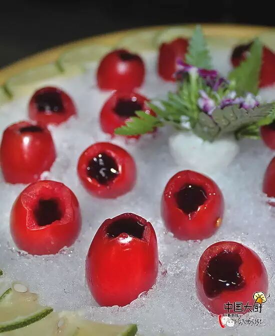 创意由来:小番茄多作为果盘中的点缀,很难卖上高价,我把番茄掏空后酿入蓝莓酱,味型协调,色泽鲜亮,售价比单卖翻了一倍。冰镇后食用酸爽可口,很开胃。