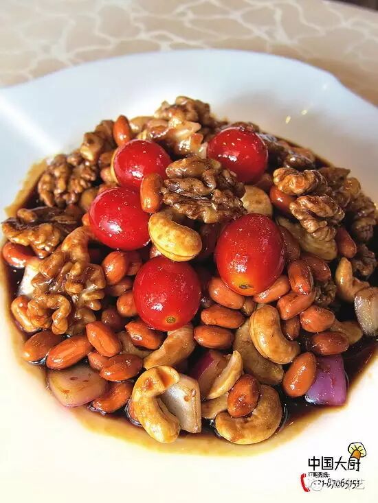 做法:云南甜酱油50克、果酱(可选用各种口味,如草莓果酱、蜜桃果酱,口味各有不同)50克、镇江香醋15克、大红浙醋15克、盐1克、味精1克拌匀,放入洗净的小番茄30克,再入炸香的花生、腰果、核桃仁各100克拌匀即可。