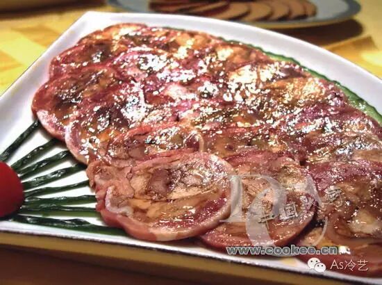 杨建华点评:建议选用偏瘦的培根,同时还要将牛肉边角料里面的肥油和筋膜去掉,因为肥油太多会降低牛肉冻的粘性,不易裹成筒,我认为培根蒸制的时间有点长,半个小时即可。