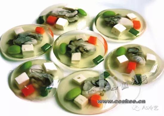 赵洪国点评:这道菜利用海鲜做肉冻,新鲜有创意;我建议不要用明胶,改用猪肉皮做肉冻汤汁,口感更好,更自然。