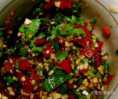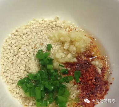 秘方三:香油打底配芝麻,花生碎,蒜泥辣椒面葱花。