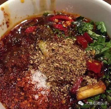 秘方一:辣油打底配辣椒粉,麻椒粉,小米椒加香菜葱花。