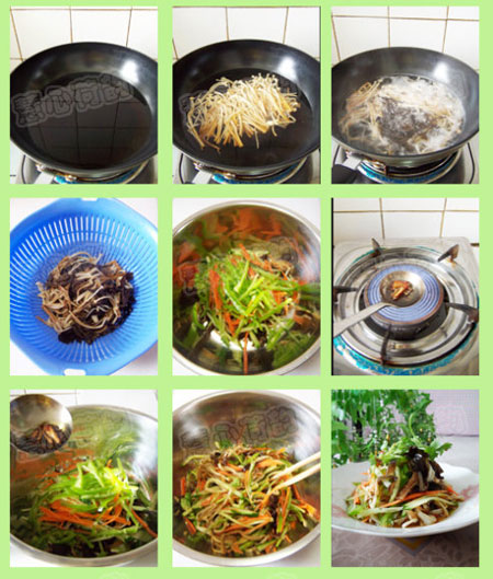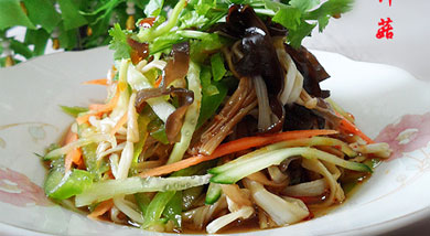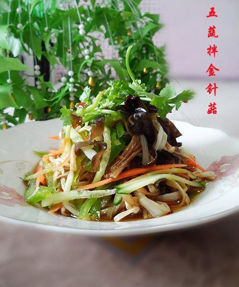 金针菇去掉老根,清洗干净。将黄瓜、胡萝卜用清水洗净切成丝,黑木耳提前用清水泡发切成丝备用。