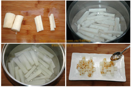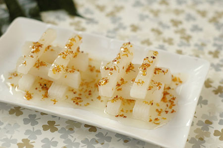 捞出后马上浸入凉白开过凉后,捞出沥干水份。把处理好的山药条摆盘,淋上桂花蜜即可。