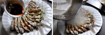 最后的浇热油程序一定不能省,非常有讲究。何为豉油?<随园食单>里有一种调料叫秋油,秋油的制作是非常讲究的,需要天气和温度的配合,而且还有不同的等级,这个秋油个人以为应该是像生抽老抽一样的东西,现在生抽老抽也分等级的,而且袁枚也是南方人,所以豉油可以分开来说,豉就是指以生抽为主料调出来的味汁,那么油就应该是热油的意思,说白了就是想要激发出豉的香味,必然需要用热油浇在豉汁上的碰撞才会有豉油香气的形成,缺一不可。