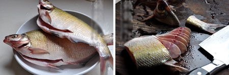 将斩杀好的武昌鱼清洗干净,特别是鱼腹内的黑膜一定要刮干净,将少许精盐倒入掌心,揉开,涂沫鱼身内外、撒上少许胡椒粉,轻拍少许料酒腌制10分钟左右;取其中一条鱼(盘中另一条鱼留做他用)把鱼头和鱼尾切下来放一边,鱼身从鱼腹处朝鱼背均匀分割成条块,注意鱼腹处不要断开;