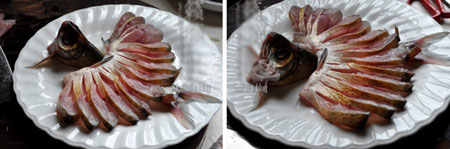 分割好之后,将鱼移至蒸盘中摆盘:鱼头固定立放,将鱼身环绕鱼头铺摊开来,宛若孔雀开屏状,整理好鱼身之后,最后将鱼尾摆上;