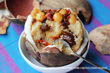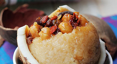椰子饭做法独特,风味别具一格,实为难得的天然食品,早在《本草纲目》及食补的民间偏方中都有记载,其具有补肾壮阳、温中理气等功效。