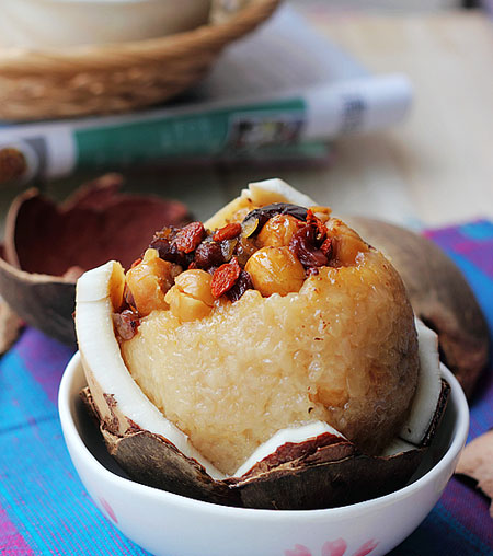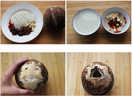材料:椰子;糯米;蜜枣;葡萄干;枸杞;莲子;冰糖;