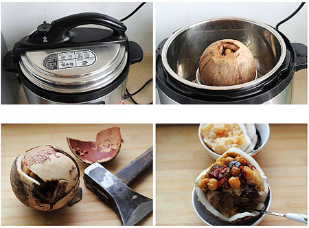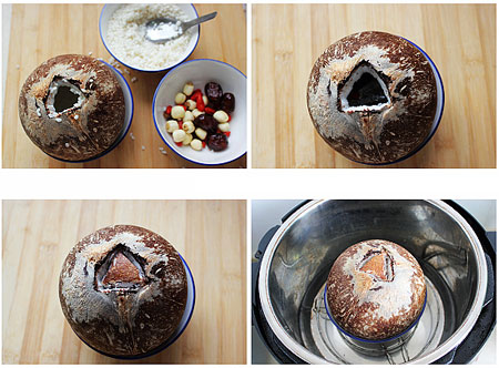 将泡好的原料沥干水分,依次将砸碎的冰糖、糯米、蜜枣、葡萄干、莲子、枸杞等放入椰壳内,最后将砍下的那块椰壳重新嵌入;放入高压锅中,蒸70分钟关火,关火后焖30分钟,最后趁热砸碎食用即可。