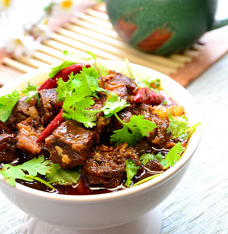 将香菜洗净切成段;将萝卜放在碗底,上面盖上牛腩,再浇上汤汁,撒上香菜即可。