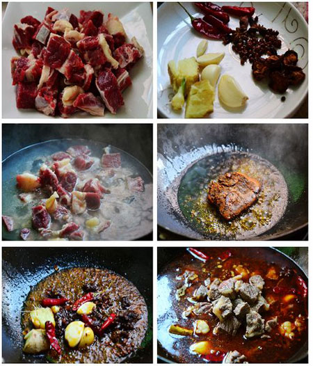 将牛腩洗净切成块;生姜拍破;牛腩放入滚水中氽水,去浮沫;炒锅放油,油热后,中小火加入火锅底料炒香;放入花椒、八角、生姜、大蒜、干辣椒炒香;锅内注入开水,加入酱油、白酒、牛腩煮沸。(水以没过牛腩为准)