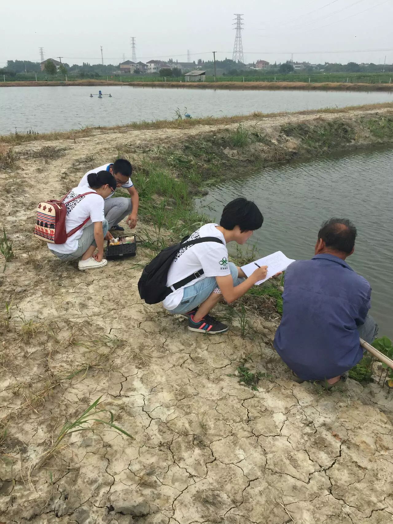 经过前期沟通,7月9号,我们一行6人统一着装(组委会的服装)前往新乡市的贾屯村进行调研工作。从学校出发前,我们5位同学在水产学院楼前同本队的导师梁俊平拍了合照留念(另一同学家在新乡赶回学校路上遇到堵车,没赶上拍照)。调研途中全靠步行,由于池塘分布较零散,结束工作后大家都有点体力不支,下午15:30才吃午饭。