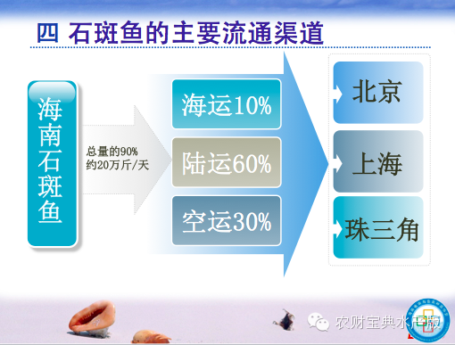 据海南省南海鱼类种苗协会常务副会长、海南大顺发水产有限公司董事长李英奋介绍,海南90%的石斑鱼是供应给内地市场,主要是北京、上海、珠三角等地,每天的流通量保守估计有20万斤。