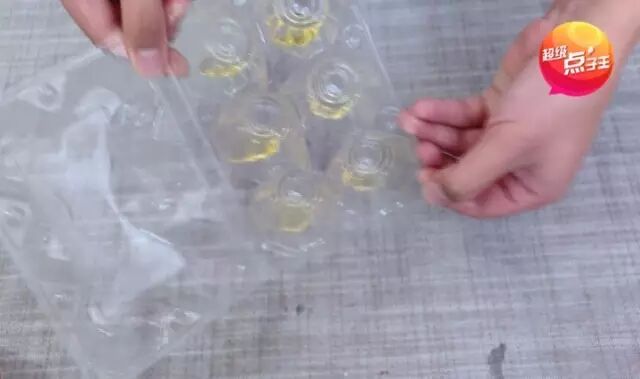 猪肉起胶后,请出邓大厨的秘密武器——鸡蛋盒!在洗净的鸡蛋盒里刷少许油,摇晃一下,让油均匀地铺在表面。▽
