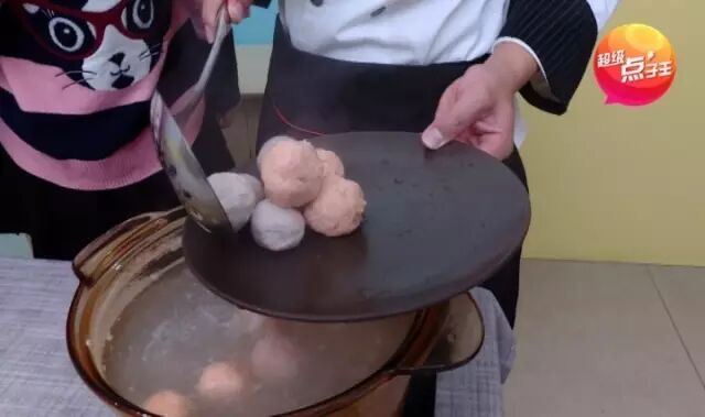 为了品尝丸子的原汁原味,咱们就用清水煮。邓大厨提醒大家,煮煮肉丸也有大学问,一定不能把水烧开,否则很容易把肉丸震裂。锅里开始冒小气泡,水温大概80-90℃左右就可以把丸子放进去了。▽