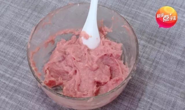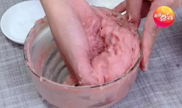 按照同一个方向搅打起胶,这样做出来的肉丸口感才会更加Q弹。▽