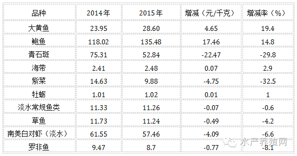 一、采集点基本情况为维持采集数据的延续性和稳定性,2015年福建省针对部分采集点被政府征用等情况,适时对个别采集点进行了调整,使得采集点更具合理性、代表性和有效性。调整后仍为17个采集县,共72个采集点,其中:淡水采集点今年未作调整,仍为39个,均为池塘养殖,分布于10个县,采集品种仍以常规鱼类、南美白对虾、罗非鱼等为主;今年海水采集点有4个进行调整,其中福州市连江县2个大黄鱼采集点因征迁退养,调整到宁德市霞浦县大黄鱼养殖区,莆田市秀屿区2个采集点在本区内调整;调整后海水采集点仍为33个,分布于7个县,有6个采集品种及养殖方式,分别为大黄鱼普通网箱养殖、石斑鱼海水池塘养殖、鲍鱼吊笼养、牡蛎筏式、海带筏式、紫菜筏式。二、养殖渔情分析从2015年的总体情况分析,淡水池塘各个主养品种总体发展呈下降态势,主要反映在价格和收入方面稳中有降,尤其以南美白对虾、罗非鱼产量和收入均有所下降,南美白对虾价格降幅较大;海水养殖情况比较复杂,突出表现在大黄鱼产量增幅较大、收入增多、价格涨幅较大;鲍鱼产量下降、收入同比增加、价格稳中有升;海带产量、收入和价格升幅均较大;紫菜产量增加,但是价格降幅较大,收入同比持平;牡蛎产量、收入均大幅下降;石斑鱼价格降幅较大。总体上全省今年养殖形势总体尚好,养殖业正进入理性投入、适应市场调节期。(一)主要指标变动情况1.出塘量、收入同比微降。2015年福建省采集点总出塘量7732吨,下降5.6%,其中海水品种出塘量4095吨,下降12.3%;淡水品种出塘量3637吨,增加3.2%;出塘总收入11733.4万元,下降33.52%,其中海水出塘收入4757.3万元,下降53.8%;淡水出塘收入6976万元,下降6.18%。主要品种中,大黄鱼出塘量增加45%、收入增加74%;受鲍鱼采集点调整,调整后的采集点水域面积大幅减少,鲍鱼出塘量减少84%、收入减少81%,;牡蛎出塘量减少58%、收入减少56%;海带出塘量增加82%、收入增加89%;坛紫菜出塘量增加63%、价格下跌,收入与去年持平;青石斑出塘量增加68%、收入增加17%;淡水常规鱼类出塘量、收入稳中有升,占淡水常规鱼类比重最大品种的草鱼产量为1509吨,增加7%;产值1695万元,比增1.63%;罗非鱼产量为268吨,下降14%,产值234万元,下降21%;南美白对虾(淡养)出塘量706.7吨,下降15.8%,收入4060万元,下降8.5%。图1 2014-2015年采集点出塘量对比图图2 2014-2015年采集点收入对比图图3 2014-2015年海水主要采集品种出塘量对比图图4 2014-2015年海水主要采集品种收入对比图图5 2014-2015年淡水主要采集品种出塘量对比图图6 2014-2015年淡水主要采集品种收入对比图2.出塘价格有涨有跌。大黄鱼均价28.6元/千克,同比上涨19.4%;鲍鱼均价135.48元/千克,同比上涨14.8%;青石斑均价52.84元/千克,同比下跌29.8%;牡蛎均价1.02元/千克,同比上涨1%;海带均价2.48元/千克,同比上涨2.9%;坛紫菜均价9.88元/千克,同比下跌32.5%;淡水常规鱼类均价11.26元/千克,同比下跌0.6%;草鱼均价11.24元/千克,同比下跌4.2%;罗非鱼均价8.7元/千克,同比下跌8.1%;南美白对虾(淡养)均价57.46元/千克,同比下跌6.6%。表1 2014、2015采集点主要养殖品种出塘价格对比表3.特点和特情分析(1)海水养殖①大黄鱼:大黄鱼网箱养殖成为主要养殖模式,占95%以上。由于缺乏科学养殖规划,出现养殖布局不合理,网箱养殖密度呈现过高状况,受港口开发和环境污染的影响,适合大黄鱼养殖的海域越来越少,深水大网箱等养殖技术尚未成熟,围网拦养模式养殖区域有限,因此,大黄鱼养殖产量短期内难以大幅提高。受2014年大黄鱼价格回升影响,2015年大部分养殖户投苗量略有增加,采集点投苗量同比增加27%左右。2015年上半年价格上涨较为明显,全年均价为28.8元/kg,同比上涨4.3%。今年大黄鱼养殖的损失主要由病害造成,大黄鱼养殖由于苗种质量衰退,网箱养殖密度过大,水流交换不畅,长期投喂冰鲜杂鱼料,导致养殖水体生态环境不良,引发病害频发,大黄鱼主要病害有“白点病”、“白鳃病”等。2015年霞浦采集点大黄鱼病害较为严重,4月份发生内脏白点病、6-7月份“白点病”、8-9月份“白鳃病”,尤以“白鳃病”死亡率最大。福鼎采集点2015年大黄鱼病害总体较好,没造成较大损失。②鲍鱼:上半年鲍鱼价格企稳上升,大部分养殖户增加投苗量,由于去年鲍苗销售不畅,部分育苗场停产,市场上鲍苗量减少,供不应求促使苗价上涨,同比上涨33%,从鲍鱼养殖成本构成分析,今年饲料费支出有明显降低,但人员工资居高不下,且在继续上涨。由于受台风和病害影响,今年鲍鱼养殖成活率较低,同比下降22%。从养殖效益分析,能盈利的养殖户占40%,微利或保本的占30%,其余的30%处于亏本状况。由于今年采集点出塘量比增47%,总体收入仍比增2.4%。采集点由于苗种来源渠道较好,投苗量比增33.6%,但是调查表明,全省总体投苗量比降约20%。③牡蛎:秀屿区采集点附苗顺利,养殖效果较好,成品单价波动在1.0-1.4元/千克,均价1.3元/千克,比增15%,平均每公顷产量90吨,产值13.5万元,平均每公顷利润10.5万元,普遍增产、增收。惠安县两个采集点由于遭受台风灾害影响,造成两个采集点经济损失36.5万元,牡蛎收购价格由去年0.94元/kg,上涨至今年1.2元/kg,同比上涨21.6%,两个采集点同比增加经济收入26.9万元。④海带:2015年海带平均售价2.48元/kg,同比上涨2.9%,质量好的、不含泥沙等杂质的食用菜,价格高,销路看好,饲料级海带(质量稍差、主要作为鲍鱼、