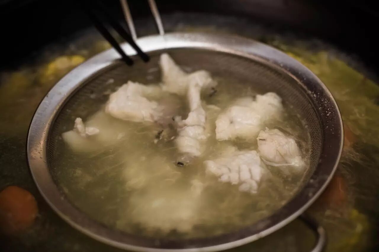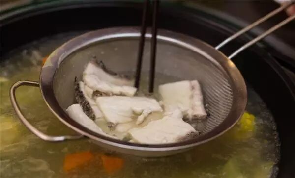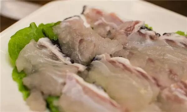 龙趸作为深海鱼火锅的主打,因为肉质结实,纹理清晰,非常适合火锅享用,薄厚适中的鱼片放入锅里“火足”过后,蘸上特制的酱料,瞬间鲜香扑鼻,食之而后快……
