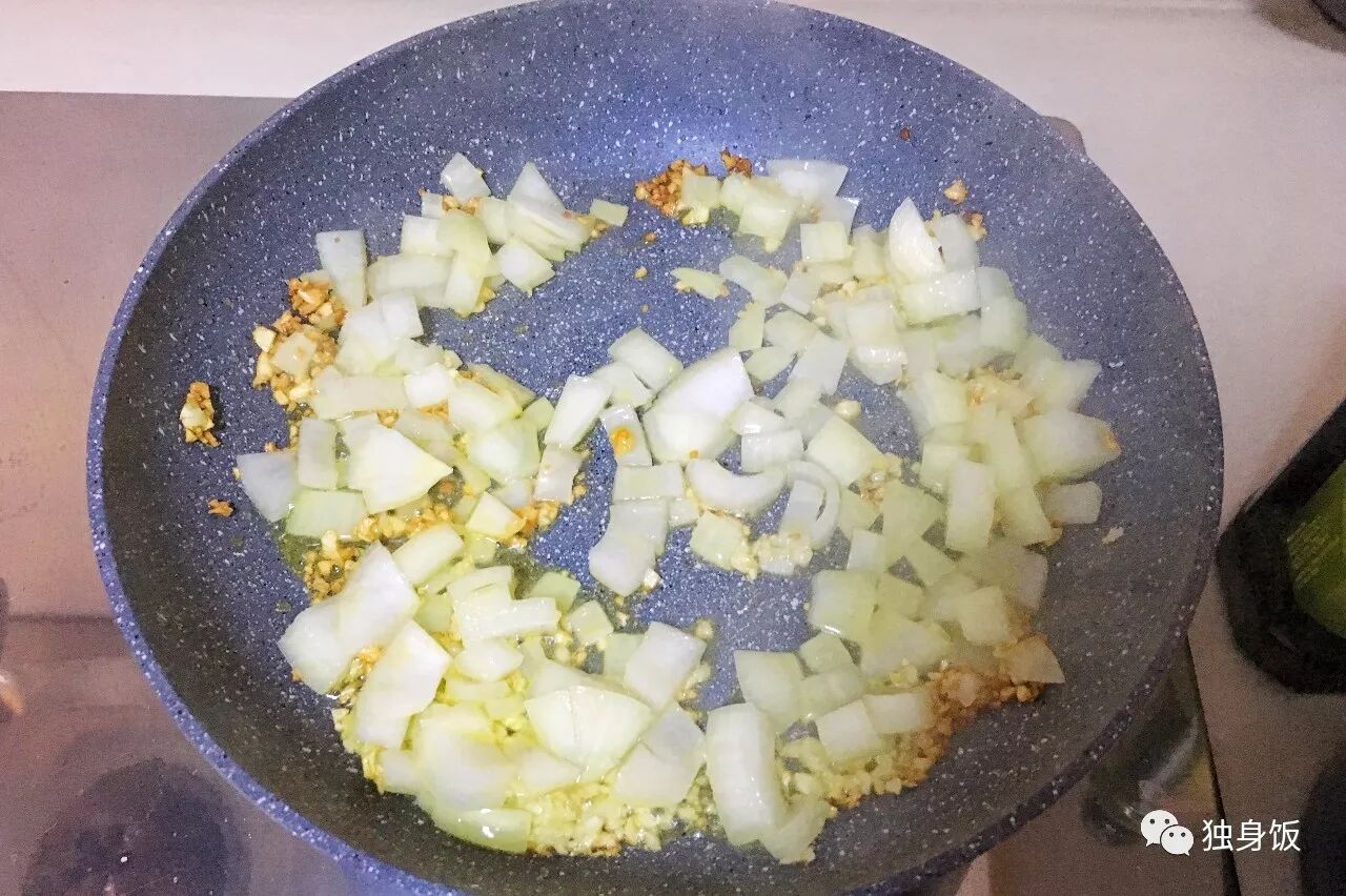 2. 锅里入油,先放入蒜末炒至金黄再放入黄洋葱翻炒至酥软