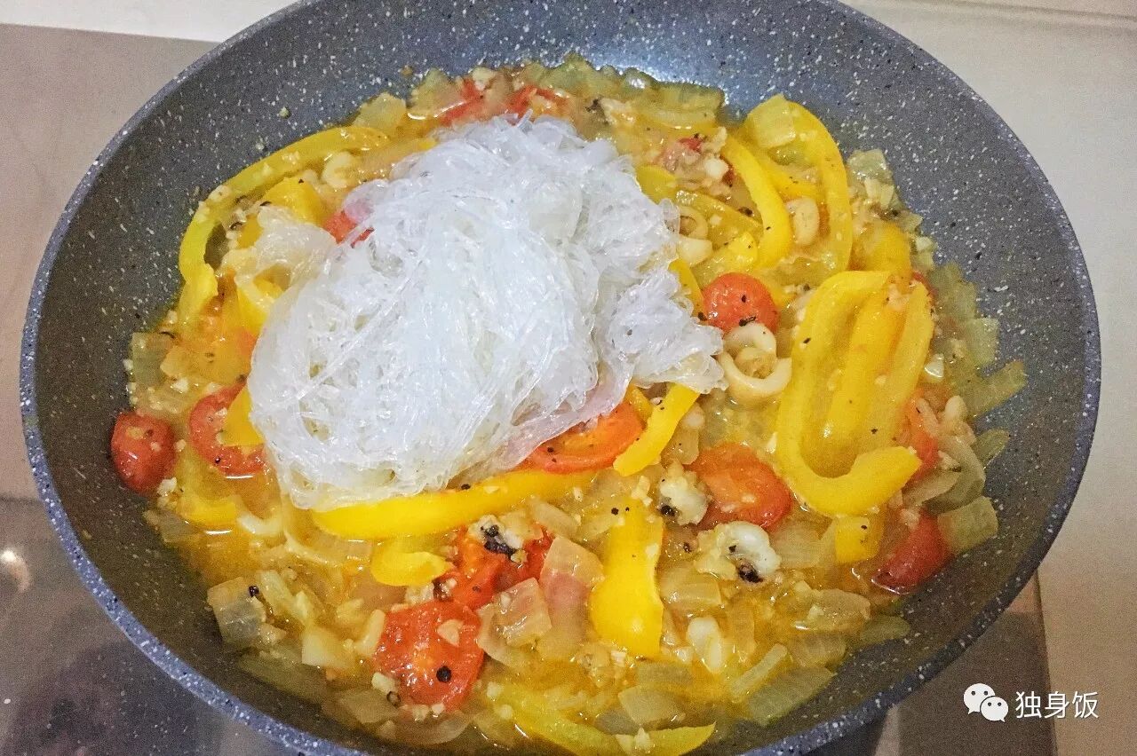 10. 一碗色泽艳丽口感浓郁的墨鱼仔烩粉丝即刻上桌