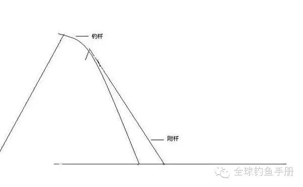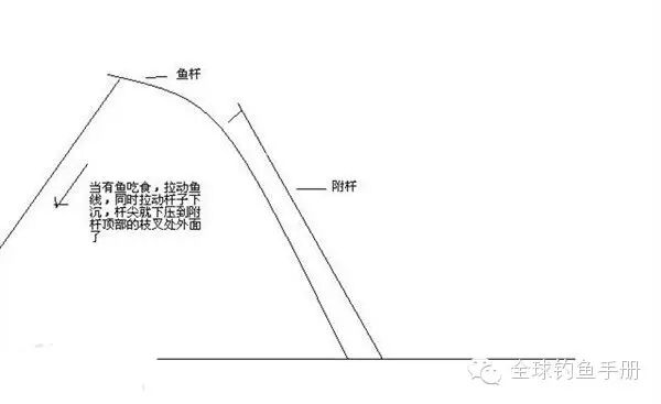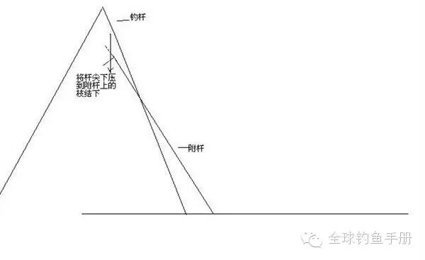 总之鱼杆和附杆做好后,要一起插在河岸上,这插杆也是有讲究的,鱼杆和附杆成X形插好,鱼杆杆尖要高于附杆,如上图所示。