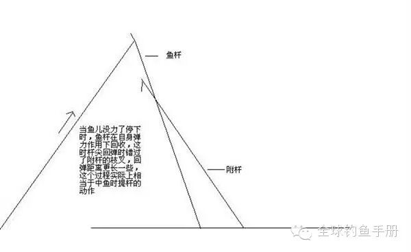 鱼儿游一会儿就游不动了,停下来,这时鱼杆在自身弹力作用下回弹,并会弹到附杆之上,回弹的距离比下压时更远,实际上是完成了提杆的动作,鱼儿就会被钩住了。