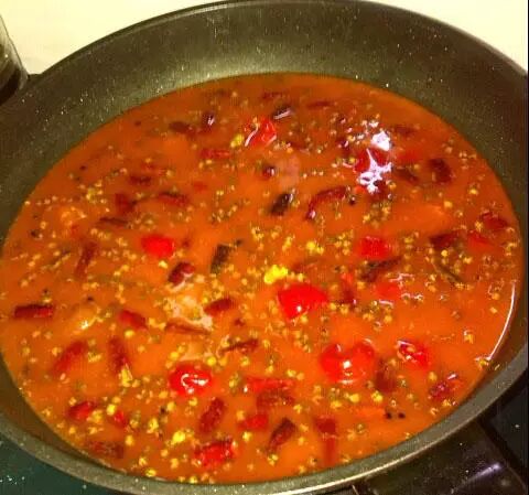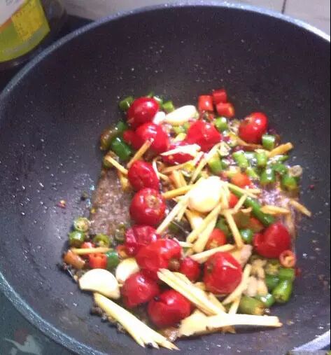 往锅头倒点色拉油,烧热了就把准备好的干海椒,蒜瓣,尖椒,泡椒,姜丝,花椒倒到锅头炒香,然后下2勺红油豆瓣和少量糖继续翻炒。