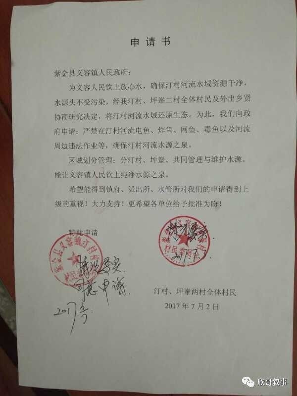 紫金县义容镇汀村河两岸,被人种植大量的桉树,桉树老板为了高产,曾经使用国家明令禁止使用的剧毒农药,对桉树林进行喷杀。一班爱心人士,看在眼里疼在心里,为了保护汀村河生态平衡,更加防止河水被剧毒农药污染,在得到政府大力支持的情况下,自发筹款一万一千多元,购买了各种鱼苗,投放到汀村河里去,万一有人投剧毒农药,河里的鱼就会死亡,引发村民注意,保护人民生命财产安全,义容镇政府还特别制作了警示牌,明令禁止在汀村河垂钓、捕鱼电鱼、和游泳。