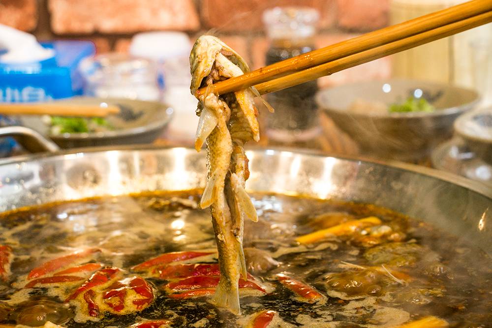 滚烫的锅底汤汁与鱼苗亲密接触