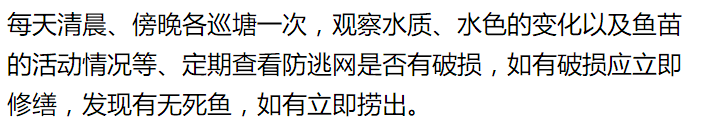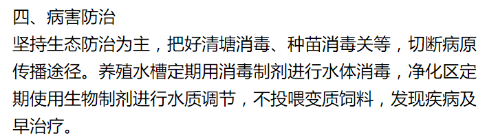 饵料选择优质、高营养和稳定性好的配合饲料为主,选择知名度大的饲料公司饲料;前期50克以下选择蛋白含量42%左右;后期50克以上选择蛋白含量40%。