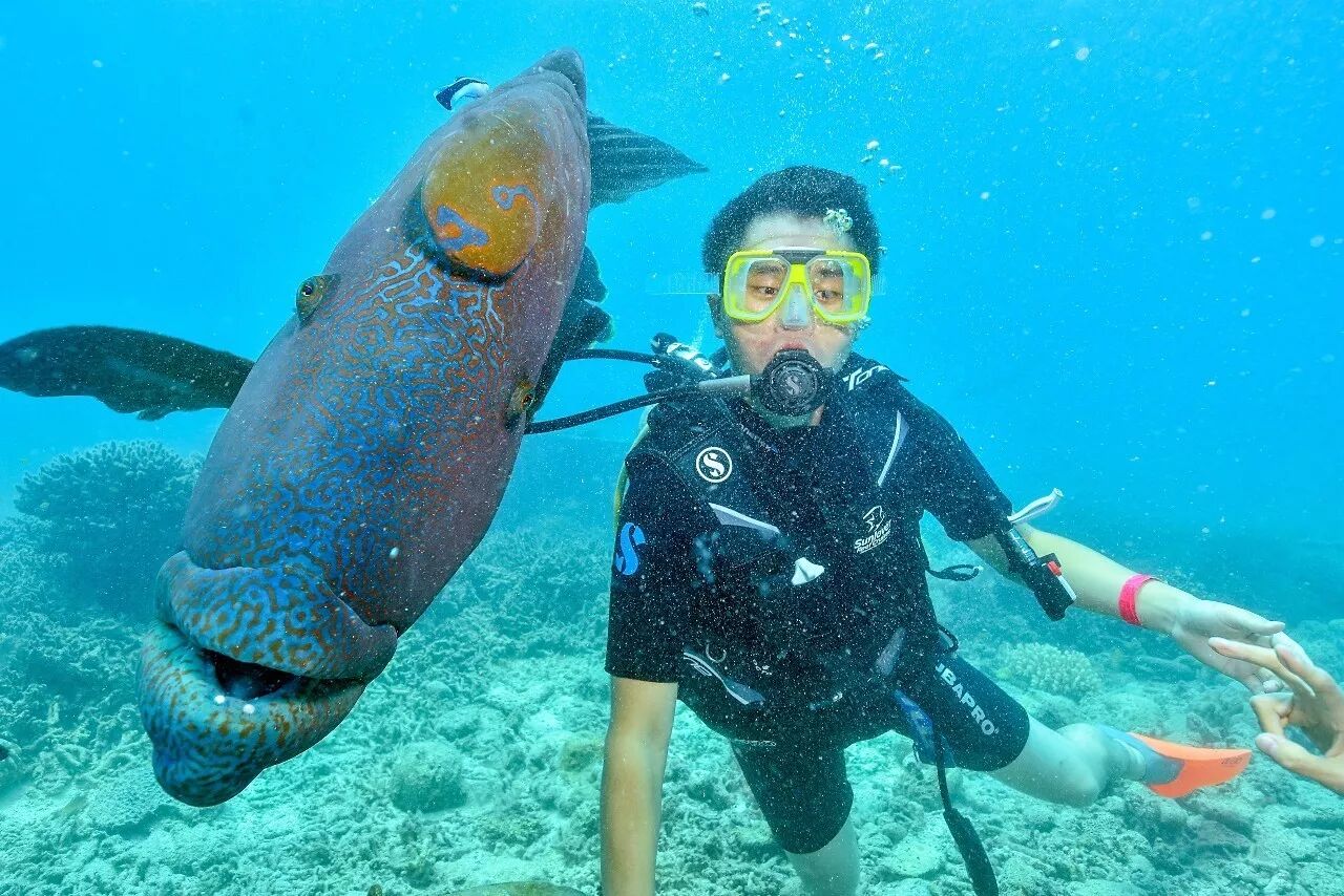 可爱的苏眉鱼属于雌雄同体雌性先熟鱼类,这类鱼的一个重要特征是可以在一定的时期改变性别。有趣的是,尽管苏眉鱼是最大的珊瑚鱼,但却很容易受到惊吓,并在受惊吓时钻入珊瑚礁寻求安全。苏眉鱼性情温和,深受潜水爱好者喜欢,因为它甚至可以允许潜水员触摸它。 但是为了我们的安全,也为了水下的小生命们的安全,潜水教练是不允许我们在水下触摸任何生物的。