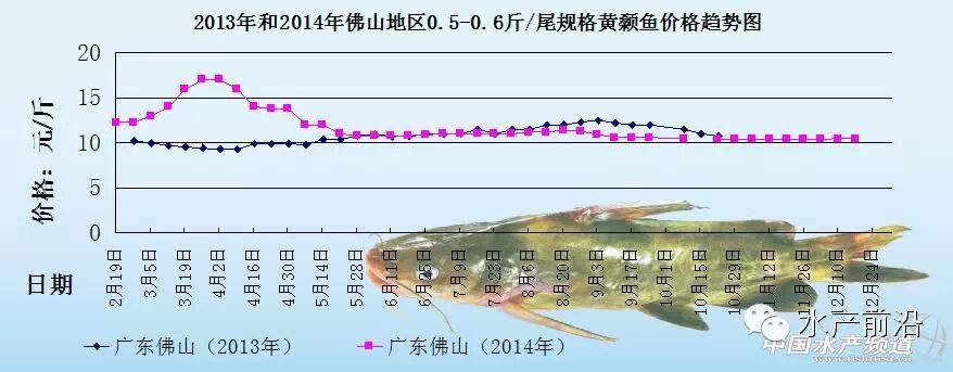 下图是2013年和2014年广东佛山地区0.5-0.6斤/尾规格黄颡鱼的价格趋势图,有图中可以看出2014年2月中旬开始,黄颡鱼的塘边收购价格就一直持续上涨,直到5月下旬鱼价才开始有所回落。2014年5月下旬至8月下旬的鱼价都是处于持续平稳的状态,这段时间的鱼价跟2013年同期的鱼价基本持平。从9月初开始鱼价开始下跌,下跌幅度较大;9月中旬至10月底整体鱼价可以说是处于最低状态,11月黄颡鱼销量慢慢上涨,鱼价相对平稳,预计在元旦假期之前广东地区的整体鱼价将会持续现状,价格不会有太大浮动。具体趋势如下: