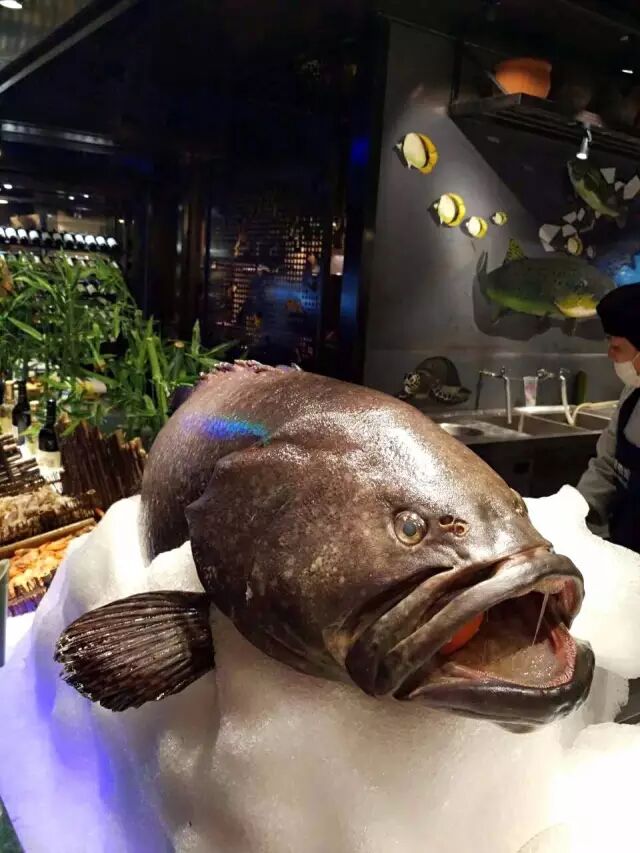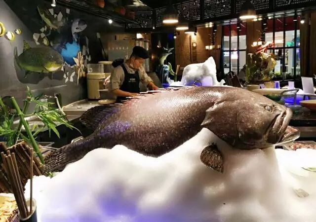 ▲ 这条深海石斑鱼,早上七点半从专机下来,60斤重,四人合抱进厨房,然而光鱼头,师傅要锯上半个小时。