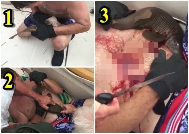 佛罗里达州一名叫麦卡提的男子日前与朋友一同出海,却被一条小鲨鱼狠咬住下腹不放,差一点被咬掉命根断子绝孙。