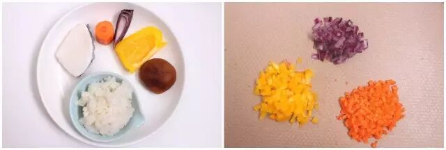 食材:鳕鱼30克、米饭50克、黄椒15克、胡萝卜15克、洋葱5克 、香菇一朵