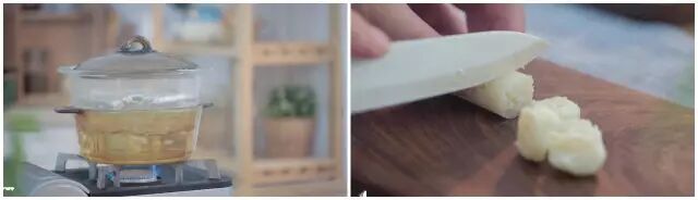 5. 切成鳕鱼丁备用,如果有鱼刺一定要剔除。