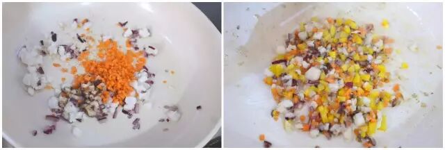 2. 青椒、胡萝卜、洋葱分别切成丁/末备用。