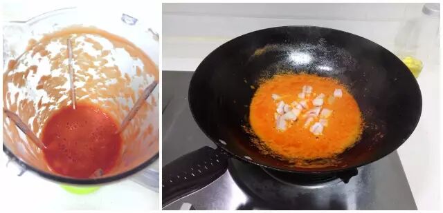 8. 将番茄泥倒回锅中加热,加入鳕鱼丁翻炒。