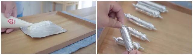 7. 将锡纸剪出大小合适的小方块,在一端挤上适量泥糊。没有锡纸也可以用蒸屉布代替。