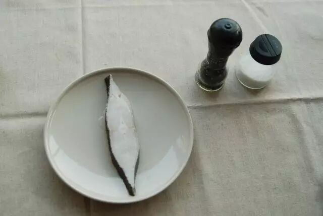 将盐、黑胡椒等香料均匀撒在鱼肉上,