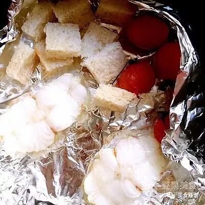 4、炸篮铺锡纸放入腌制好的鳕鱼块和小番茄190度烤10分钟