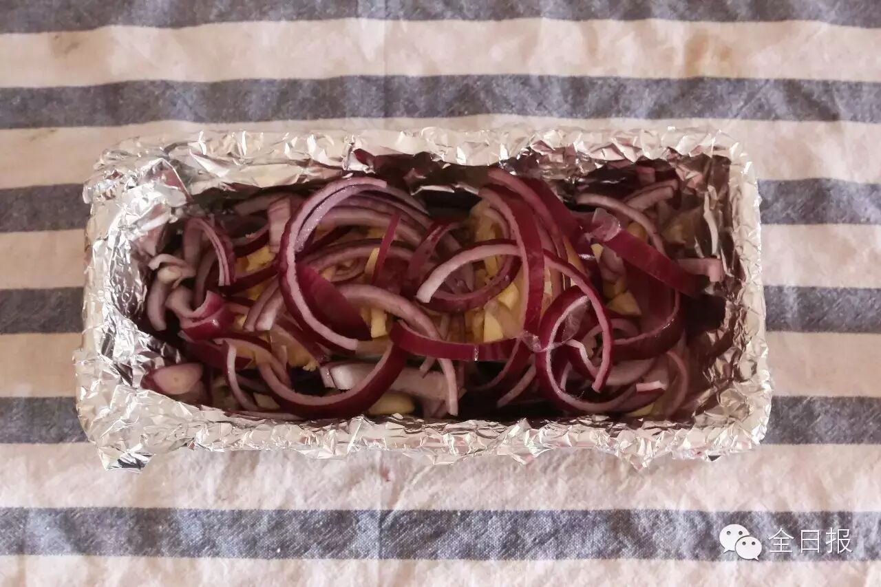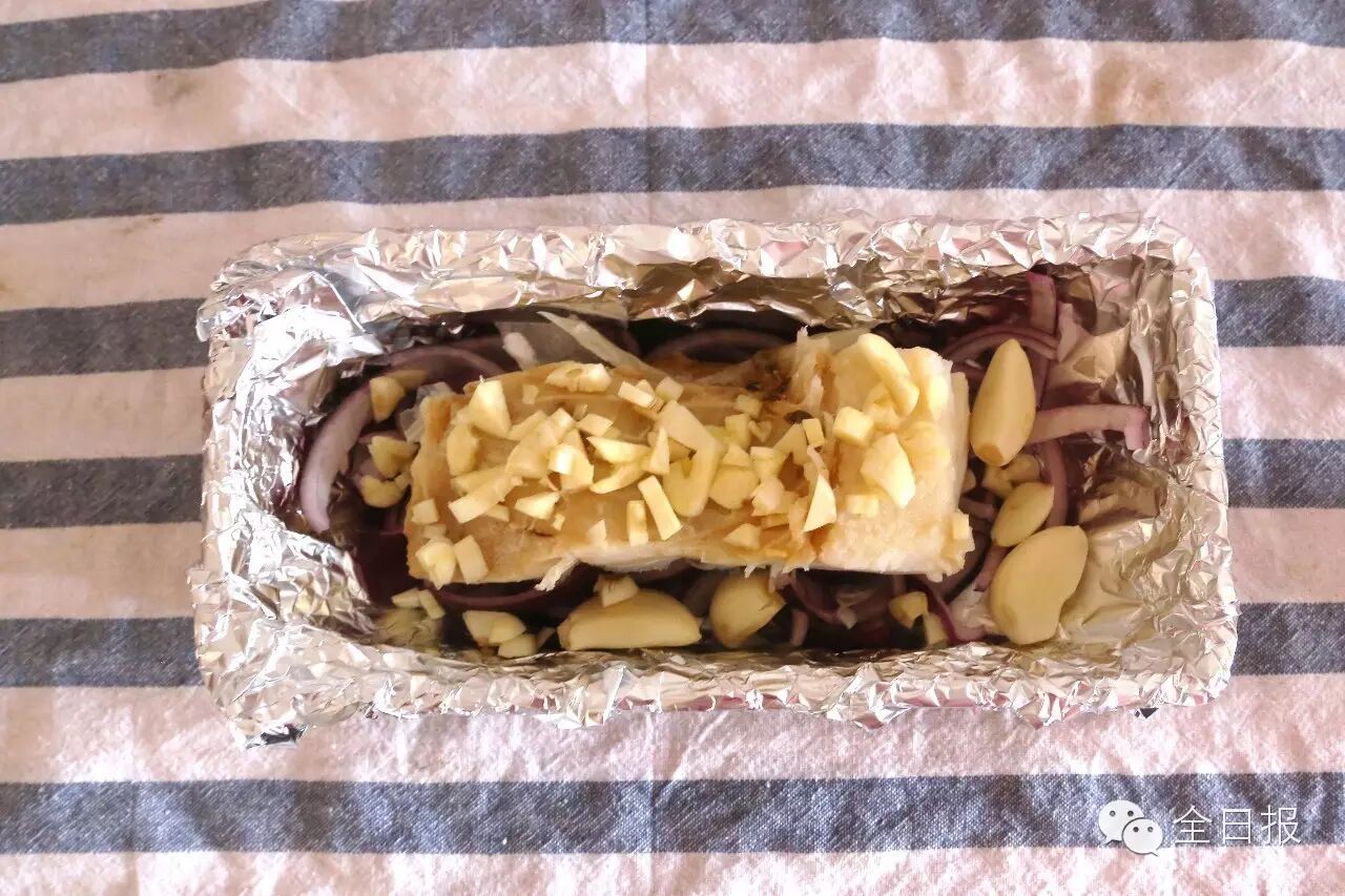 准备一个大小合适的烤具,铺上锡纸。最下面铺一层洋葱,把鳕鱼放在洋葱上,在鳕鱼肉上铺满蒜粒,最后再铺一层洋葱。