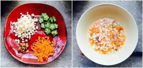 3.将蒸熟后的胡萝卜粒、杏鲍菇粒、香菇粒,放入淮山鱼泥中用汤勺搅拌均匀,然后摆上切片的秋葵,选好位置打一个蛋,清蒸15分钟;