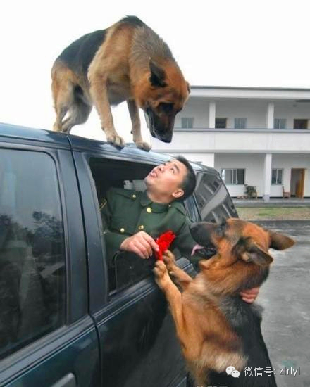 这个叫小鲁的战士退伍走的那一天,他一直训练的警犬“待发”和“大海”一直拉扯他的行李,不让他走。好容易坐上车了,“待发”突然蹿上车顶,“大海”扑车窗狂叫,车只好停下来,连司机都哭了 。![]()