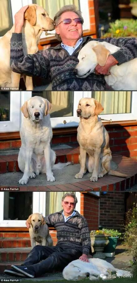 Waspe先生是个盲人,导盲犬陪伴了他六年。后来,狗狗的眼睛因病失明......再后来,Waspe先生又养了一只导盲犬。现在,新狗狗为他俩导盲。![]()