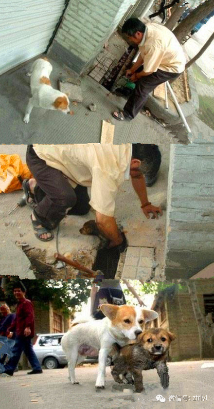一只流浪小狗掉入下水道,狗妈妈向路人求救,一位大叔找来了冲击钻和榔头,砸开下水道将小狗救了出来,小狗得救,狗妈妈对他寸步不离。![]()