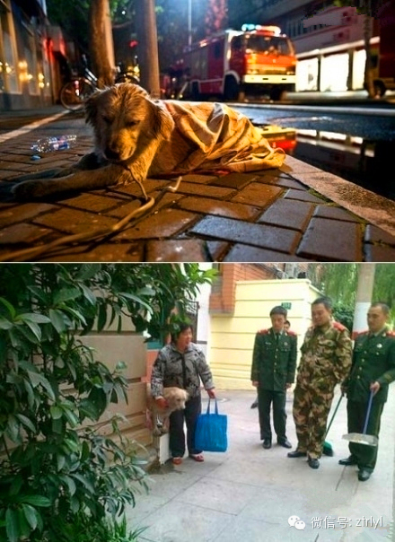 上海火灾现场,守望犬晶晶不吃不喝,流着眼泪等待主人的出现。在被消防战士抱回暂时收养后,晶晶仍然情绪低落,不吃不喝。直到主人来到了消防中队,晶晶立即跳起来,向主人奔去,吃下了40个小时以来的第一口食物。消防队员感慨说:“一看就知道这是主人来了。”![]()