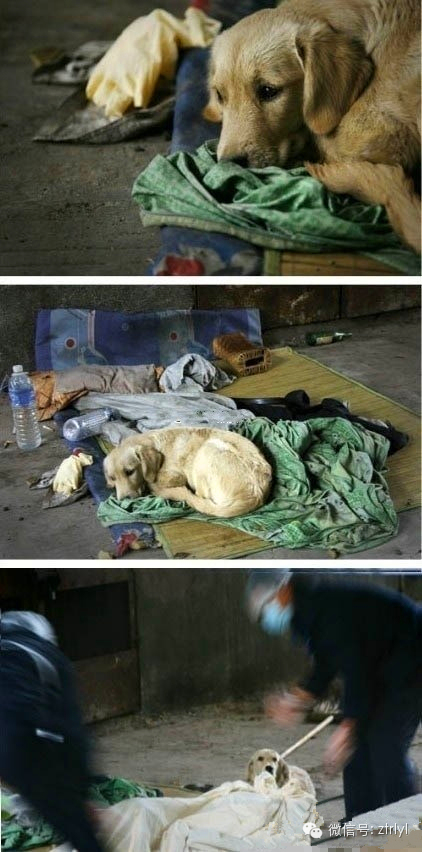 主人被埋在里面已经死去了,但是小狗每天总是在外面叼救援人员的食物进去废墟给她。它一直这么守在废墟上,不肯离开,因为这里是它的家,它的主人还在里面,小冯说,要是废墟旁有赶不动的家养狗,说明那下面一定埋着主人。不理睬它,它会不停地叫;掘地救人时,它直盯盯地瞅;等到主人身体露出,狗会冲上去刨地,刨到脚掌流血(要是换成是我们,狗狗被埋在下面我们会这样吗?)![]()