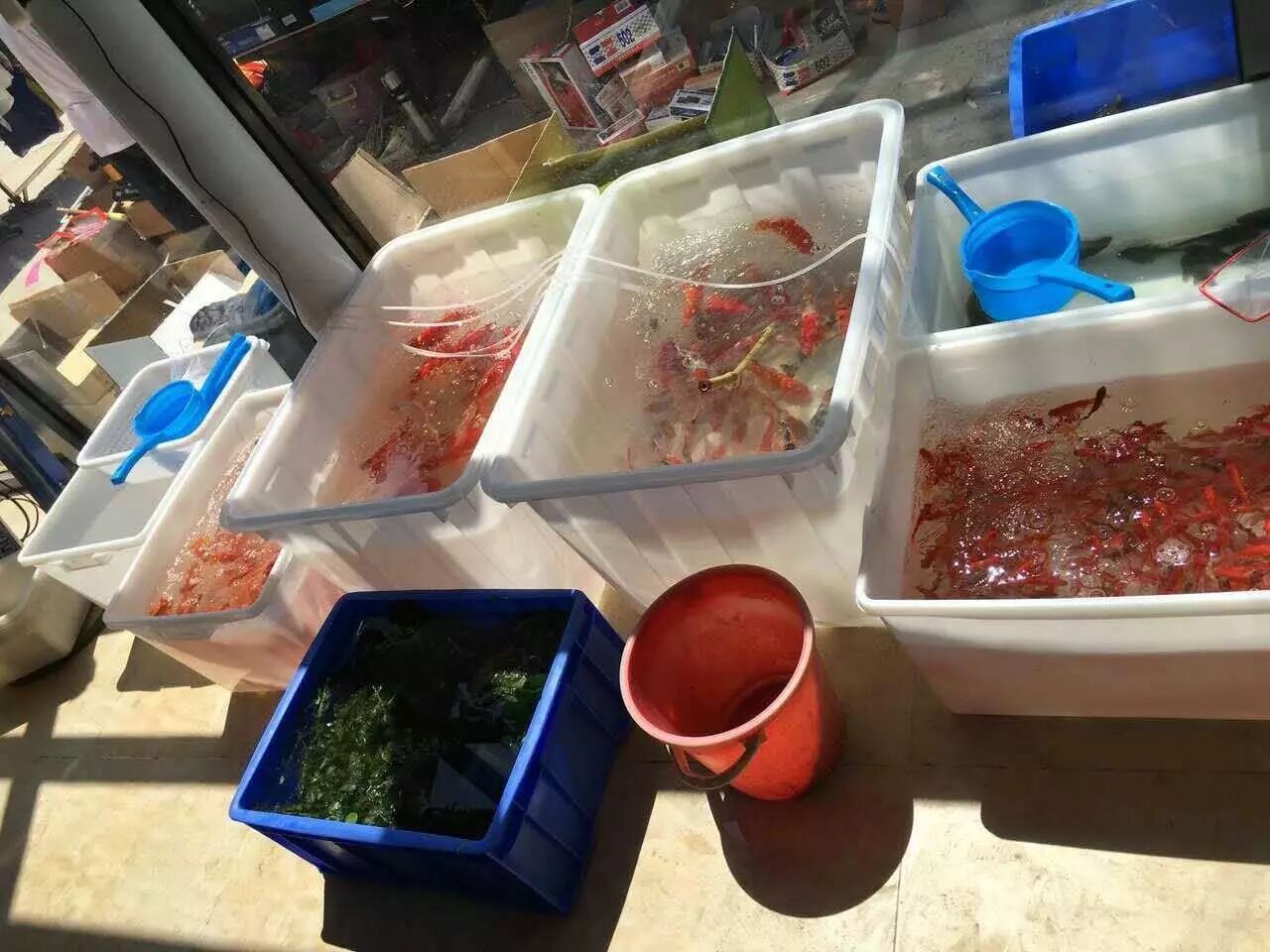 精品厅在花鸟市场中间的位置。第一排简直就是爱鱼人的天堂。成百上千的金鱼游的那叫一个起劲。